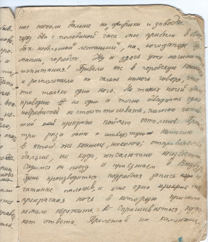 …поехали дальше на фабрики и заводы. Через два с половиной часа мы прибыли в [Анс]бах небольшой песчаный городок. Ну а здесь уже начинаются испытания! Привели нас в городскую конюшню и расположили на соломе, много говоря, что это только одна ночь. Но таких ночей было проведено не одна а точно двадцать одна.
