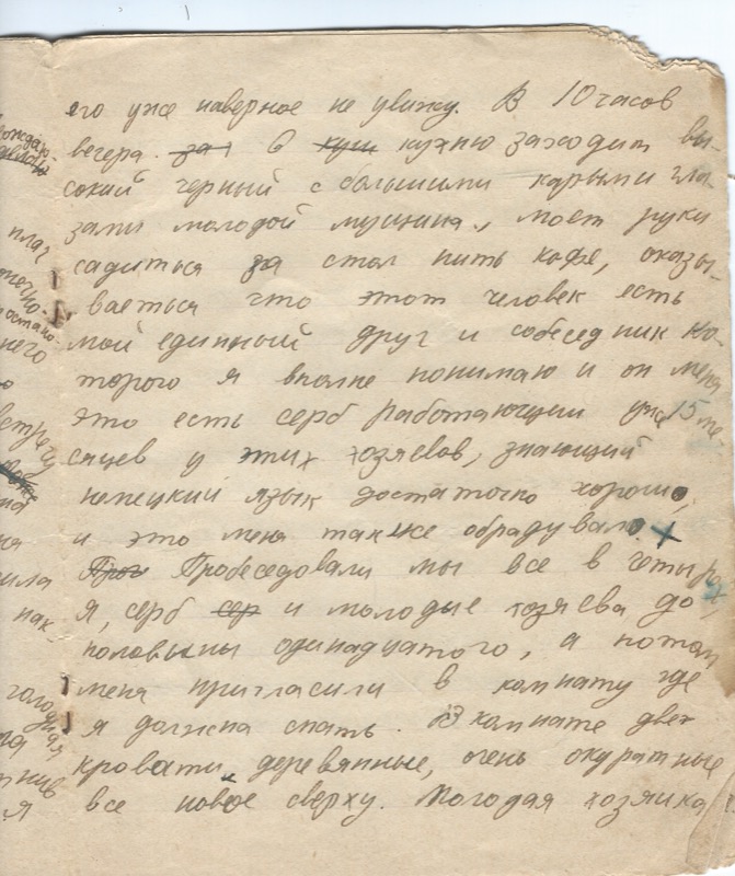 В 10 часов вечера в кухню заходит высокий чёрный с большими карими глазами молодой мужчина, моет руки, садится за стол пить кофе. Оказывается что этот человек есть мой единственный друг и собеседник, которого я вполне понимаю и он меня. Это есть серб, работающий уже 15 месяцев у тех хозяев, знающий немецкий язык достаточно хорошо, и это меня также обрадовало.