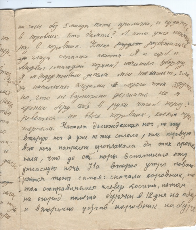 На второе утро повторяется то же самое: сначала коровник, потом отправляемся клевер косить, потом на огород полоть бурачки, в 12 дня — на обед, и вторично убрав коровник…