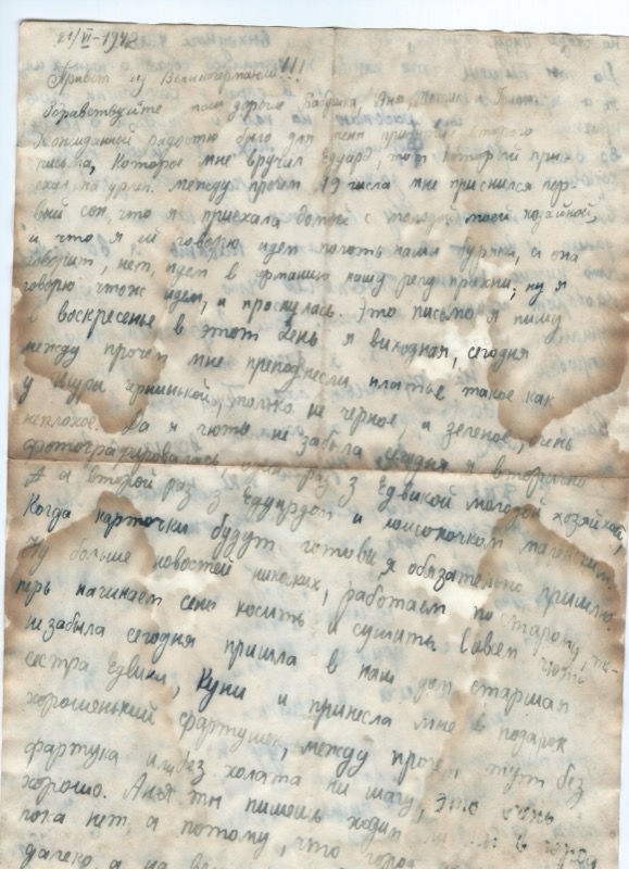 21/VI–1942. Привет из Великогермании!!! Здравствуйте наши дорогие Бабушка, Аня, Мотик и Гришуня. Неожиданной радостью было для меня принятие второго письма, которое мне вручил Эдуард, тот который приехал на урлён. Между прочем 19 числа мне приснился первый сон, что я приехала домой с молодой казацкой, и что я ей говорю идем погоним нашу бурку, а она говорит, нет, идем в Германию нашу речку, ну я говорю что ж идем, и проснулась. Это письмо я пишу в воскресенье в этот день я выходная, сегодня между прочем мне преподнесли платье такое как у Шуры, только не черное, а зеленое, очень неплохое. Да я чуть не забыла сфотографировалась сегодня я сфотографировалась а я второй раз с Эдвигой молодой хозяйкой, с Эдуардом и мальчонком маленьким.