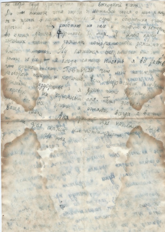 …но скоро буду ездить, меня выходной учат. Да ты пишешь что какая я осталась, о нет я имею кремы, в первых работаю в сарае и босоножки очень красные в которых работаю на поле и туфли в которых во время дождя. Я имею пару хороших чулки и завязки которыми ноги завязываю. Ну кажется всё, конечно это не всё, далеко не всё, но я когда сажусь писать я всё забываю что нужно писать. Повторяю что мне не плохо, а наоборот полезно и хорошо. Если вырастет клубника кушайте на здоровье, а я здесь тоже фрукты попробую у нас окольный сад. Пока досвидания целую вас всех крепко и остаюсь всегда с вами Ваша Раїса.