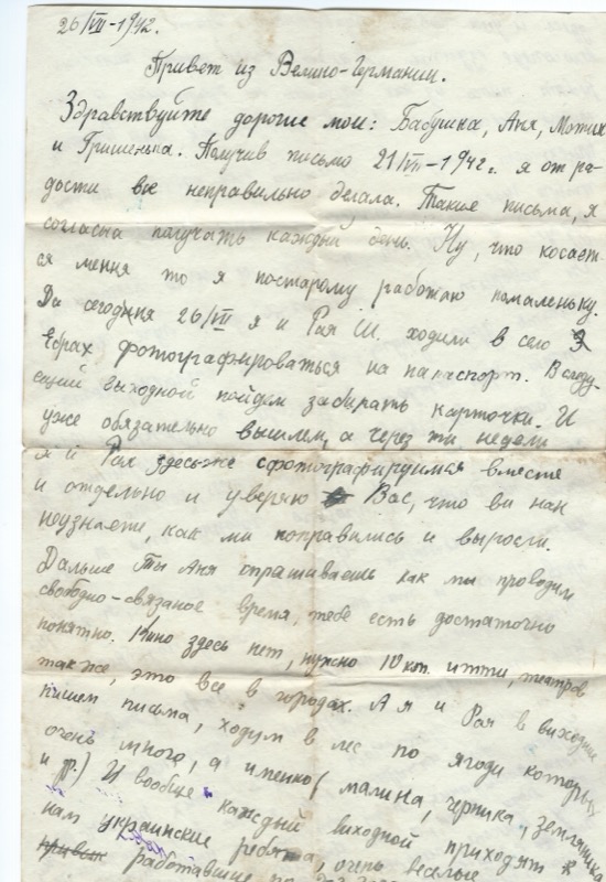 26/VII – 1942. Привет из Велико-Германии. Здравствуйте дорогие мои: Бабушка, Аня, Мотик и Гришенька. Получив письмо 21/VII – 1942. я от радости все неправильно делала. Такие письма, я согласна получать каждый день. Сегодня 26/VII я и Рая Ш. ходили в село за 3 км в Эбрах фотографироваться на паспорт. В следующий выходной пойдем забирать карточки. И уже обязательно вышлем, а через три недели я и Рая здесь-же сфотографируемся вместе и отдельно и уверяю Вас, что вы нас не узнаете, как мы поправились и выросли. Кино здесь нет, нужно 10 км итти, театр также. А я и Рая в выходные пишем письма, ходим в лес по ягоды которых очень много, а именно малина, черника, земляники.