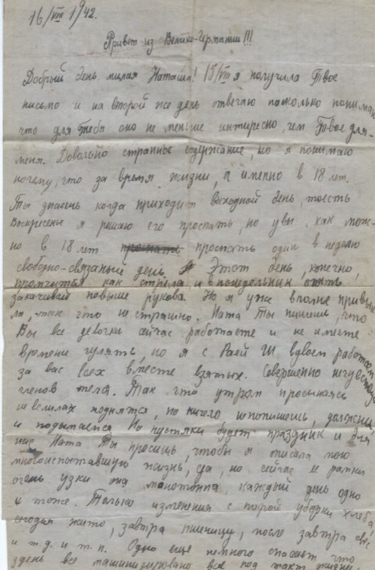 16/VIII 1942. Привет из Велико-Германии!!! Добрый день милая Наташа! 15/VIII я получила Твое письмо и на второй же день отвечаю поскольку понимаю, что для тебя оно не меньше интересно, чем Твое для меня. Довольно странное содержание, но я понимаю почему, что за время жизни, а именно в 18 лет. Ты знаешь когда приходит выходной день, то есть воскресенье я решаю его проспать, но увы, как можно в 18 лет проспать один в неделю свободно-связанный день. А Этот день, конечно, пролетит как стрела, и в понедельник опять закатывай повыше рукава. Но я уже вполне привыкла, так что не страшно. Ната Ты пишешь, что Вы все девочки сейчас работаете и не имеете времени гулять, но я с Раей вдвоем работаю за вас всех вместе взятых. Совершенно изувеченных членов тела. Так что утром просыпаешься невсилах подняться, но ничего потопчешь, далекишься и подымаешься. Но пустяки будет пра[здник…]