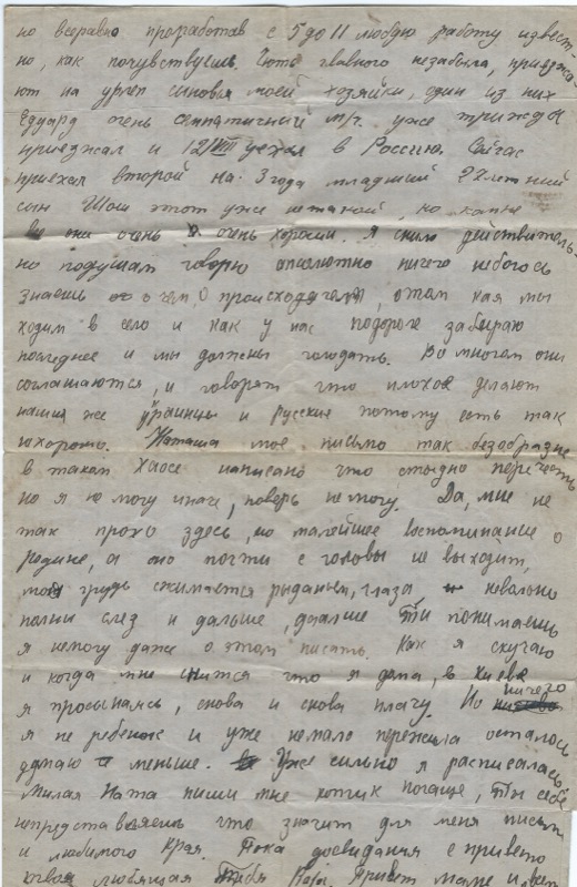…но всеравно проработав с 5 до 11 любую работу известно, как почувствуешь. Чуть главного не забыла, приезжают на урлен сыновья моей хозяйки, один из них Эдуард очень симпатичный молодой человек уже трижды приезжал и 12/VIII уехал в Россию. Сейчас приехал второй на 3 года младший 21-летний мой сын Шон этот уже не такой, но как бы они очень и очень хороши. Я сила действительно но подумай говорю абсолютно ничего никого себе знаешь со всем о происходящим… Во многом они соглашаются, и говорят что плохо делают наши все украинцы и русские потому есть так нехорошо. Наташа мое письмо так безобразие в таком хаосе написано что стыдно перечесть но я не могу иначе, поверь не могу. Да, мне не так плохо здесь, но малейшее воспоминание о родине, оно почти с головы не выходит, тогда грудь сжимается рыданьем, глаза невольно полны сл[ёз…]