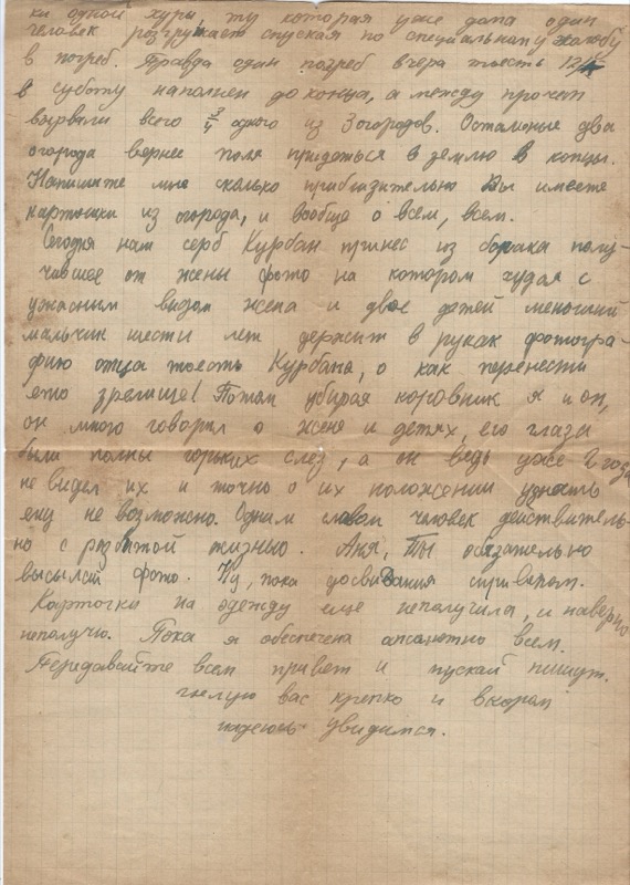 Сегодня нам серб Курбан пришес из барака получившее от жены фото на котором сидя с ужасным видом жена и двое детей меньший мальчик шести лет держит в руках фотографию отца тоесть Курбана, о как перенести его границе! Потом убирая коровник я и он, он много говорил о жене и детях, его глаза были полны горьких слез, а он ведь уже 2 года не видел их и точно о их положении узнать ему не возможно. Одним словом человек действительно с разбитой жизнью. Аня, Ты обязательно высылай фото. Ну, пока досвиданья привелом. Карточки на одежду еще неполучила, и наверно получу. Пока я обеспечена абсолютно всем.