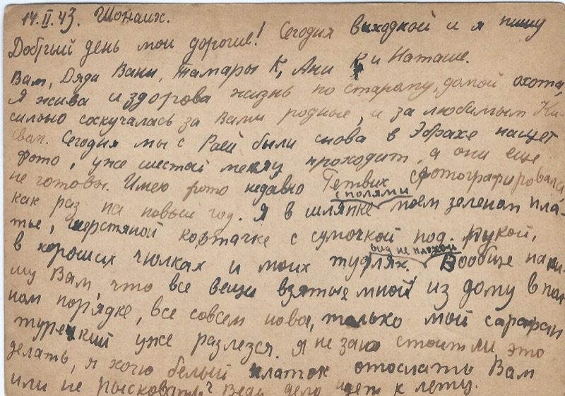 14.II.43. Шонайх. Добрый день мои дорогие! Сегодня выходной и я пишу Вам, Дяде Ваке, Тамаров К, Ани К и Наташе. Я жива и здорова жизнь по старому, домой охота, сильно соскучалась за Вами родные, и за любимым Ки[евом]. Сегодня мы с Раей были снова в Эбрахе насчет фото, уже шестой месяц проходит, а они еще не готовы. Имею фото недавно Генвих сфотографировал как раз на новый год. Я в шляпке поем зеленом платье, шерстяной кофточке с сумочкой под рукой, в хороших чулках и моих туфлях. Вообще намишу Вам, что все вещи взятые мной из дому в полном порядке, все совсем новое, только мой сарафан турецкий уже разлезся. Я не знаю стоит ли это делать, я хочу белый платок отослать Вам или не рисковать? Ведь дело идет к лету.