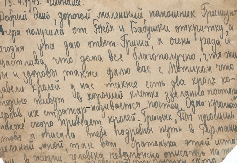 1. Добрый день, дорогой маленький папашник Гришунок! Вчера получила от тебя и Бабушки открытку, а сегодня уже даю ответ. Гриша, я очень рада и счастлива что дома все благополучно, что живы и здоровы, также фалю вас с Мотиком что завели кралей и нас также есть два кролика которые пашут в хорошей клетке зделано постоянно […], их страксар — называется постепенно. Одна краниха также скоро приведет кралей. Гришук, ты просишь чтобы я описала тебе подробно путь в Германию далений мной, так вот фрагментка этой истории […] в жизни человека невозможно описать на таком…