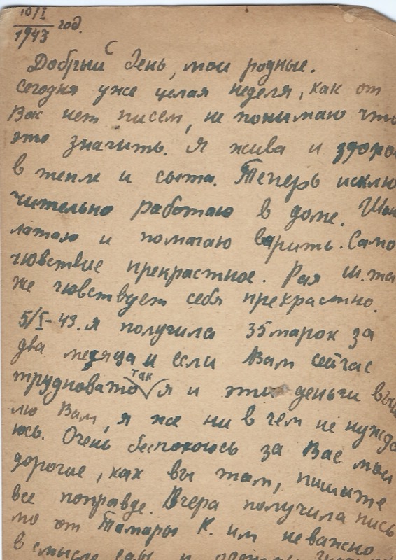 10/I 1943 год. Добрый день, мои родные. Сегодня уже целая неделя, как от Вас нет писем, не понимаю что это значить. Я жива и здорова, в тепле и сыта. Теперь исключительно работаю в доме. Шью, латаю и помогаю варить. Самочувствие прекрасное. Раз М. тоже не чувствует себя прекрасно.