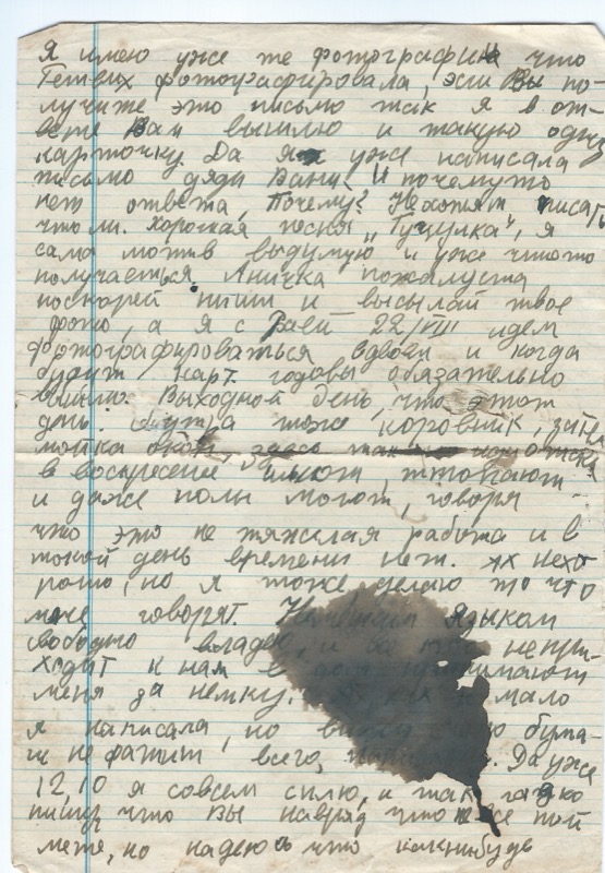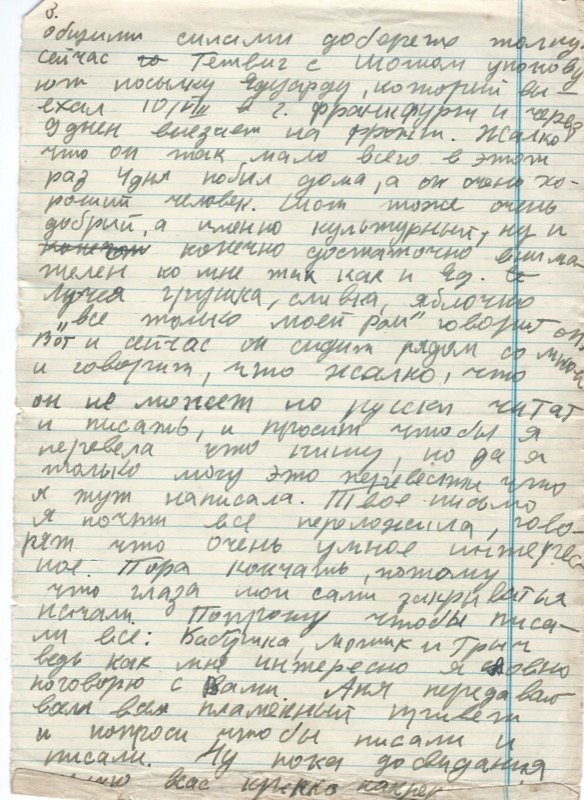 …Сейчас Тетвиг с Мамой упаковывают посылку Эдуарду, который выехал 10/VII в г. Франкфурт и через 8 дней выезжает на фронт. Жалко что он так мало всего в этот раз 4 дня побыл дома, а он очень хороший человек. Стот тоже очень добрый, а именно культурный, и конечно достаточно внимателен ко мне так как и Эд. Я грушка, слива, яблочко “всё только моей Рай” говорит он. Вот и сейчас он сидит рядом со мной и говорит, что жалко, что он не может по русски читать и писать, и просит чтобы я перевела что пишу. Твоё письмо я почти всё переводила, говорят что очень умное интересное.