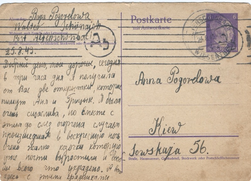 A glimpse of daily life in occupied Kyiv: someone broke into the family’s home on a Sunday night and stole their cat (nearly full-grown) and other possessions. Raisa, reading about this 2,000 km away, is “upset to tears.” The theft is a reminder that while her letters focus on farm routines and parcels, life in Kyiv under German occupation meant poverty, scarcity, and crime.