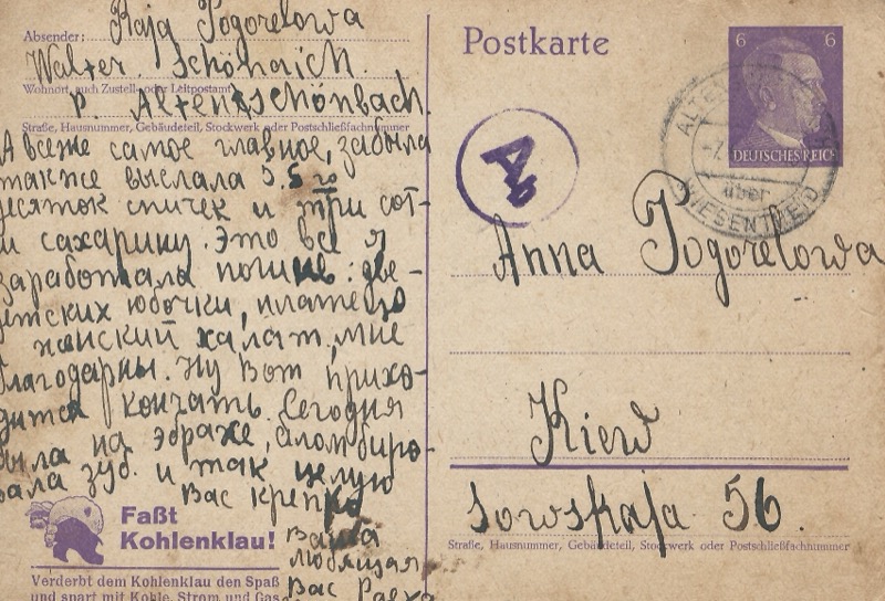 A brief postcard documenting Raisa’s barter economy: she sews skirts, dresses, and women’s robes for German villagers, earning matches and saccharin tablets that she sends home to Kyiv. She also had dental care — a tooth filling — suggesting she had access to basic medical services. She signs with the variant spelling “Раеса” rather than the usual “Раиса.”